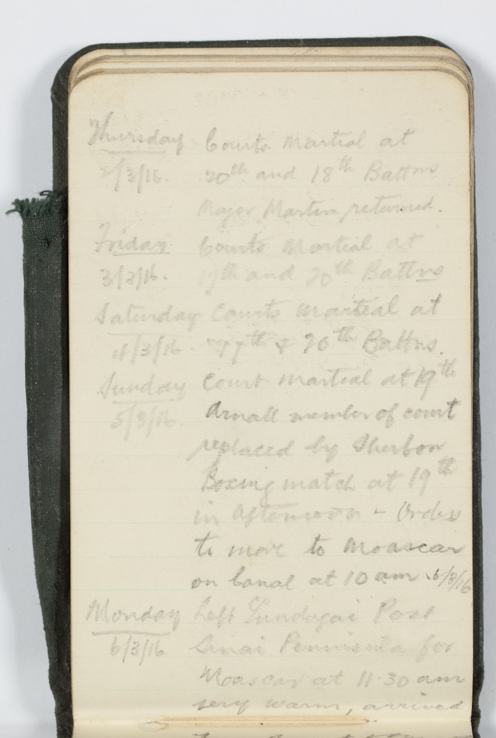 Sunday 5/3/16 Court Martial at 19th Arnall member of court replaced by Sherbon Boxing match at 19th in afternoon - Orders to move to Moascar on Canal at 10 am 6/3/16