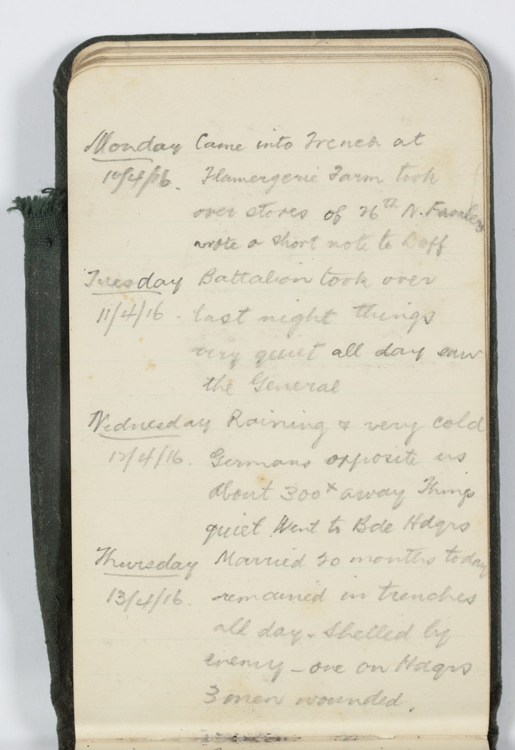 Thursday 13/4/16 Married 20 months today remained in trenches all day. Shelled by enemy - one on Hdqrs 3 men wounded.