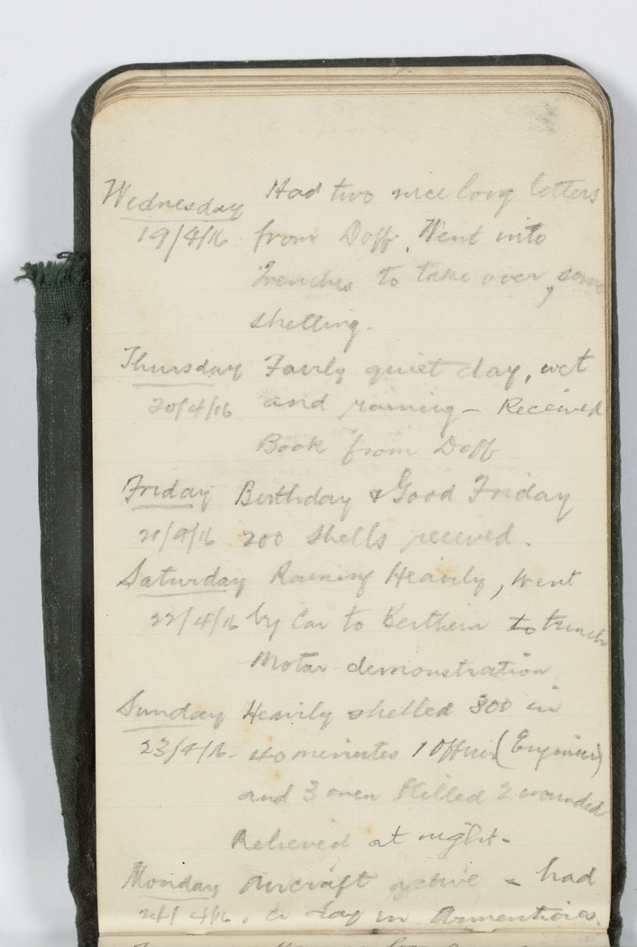 Wednesday 19/4/16 Had two nice long letters from Doff. Went into Trenches to take over, some shelling.