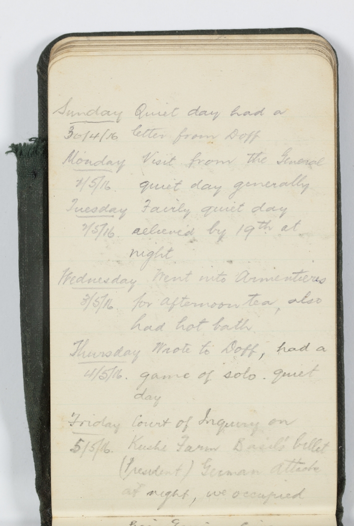 Friday 5/5/16 Court of Inquiry on Kushe Farm Basil's billet (President) German attacks at night, we occupied
