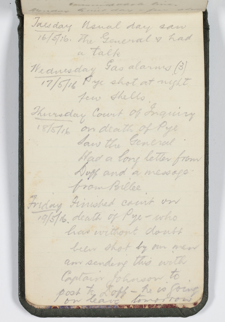 Friday 19/5/16 Finished court on death of Pye - who had without doubt been shot by our men am sending this with Captain Johnson to post to Doff - he is going on leave tomorrow