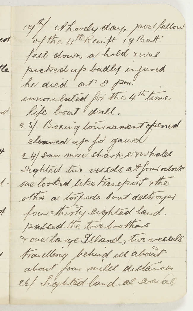 A lovely day, poor fellow of the 4th Reinft 19 Batt fell down a hold & was picked up badly injured he died at 8pm.