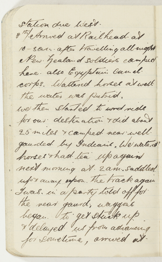 Arrived at Railhead at 10-3 am after travelling all night. New Zealand soldiers camped here also Egyptian camel corps.