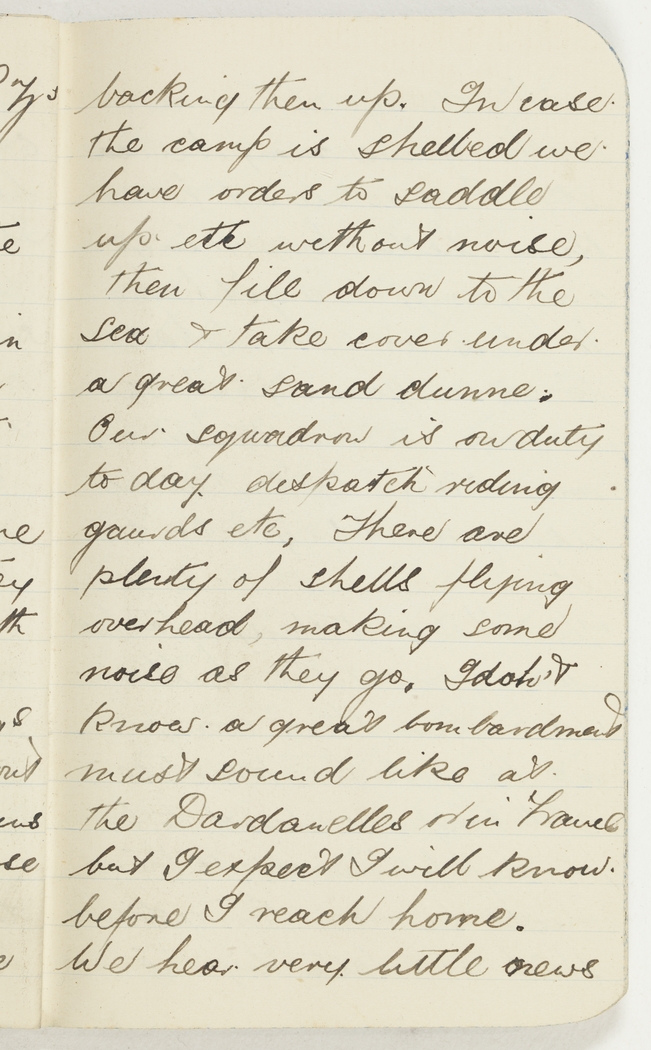 Our squadron is on duty today dispatch riding gaurds etc, There are plenty of shells flying overhead, making some noise as they go. I don't know a great bombardment must sound like at the Dardanelles or in France but I expect I will know before I reach home.