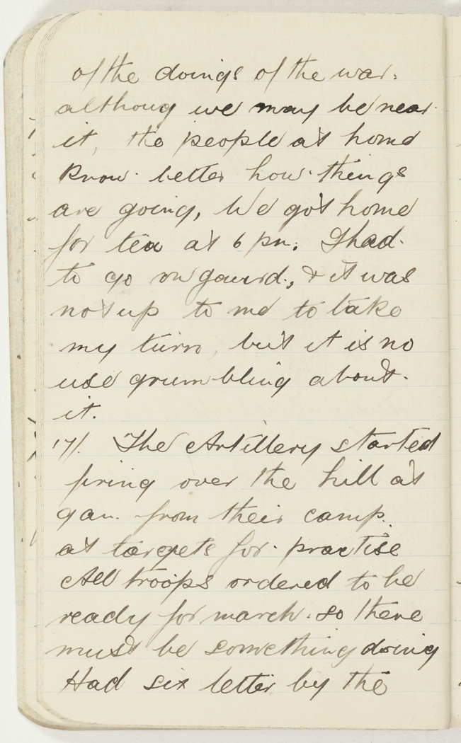 of the doings of the war, althoug we may be near it, the people at home know better how things are going, We got home for tea at 6pm, I had to go on gaurd, & it was not up to me to take my turn, but it is no use grumbling about it.