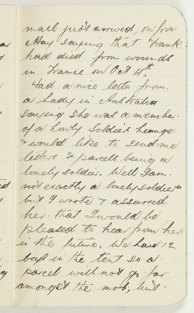 mail just arrived, on from May saying that Frank had died from wounds in France on Oct 4th.