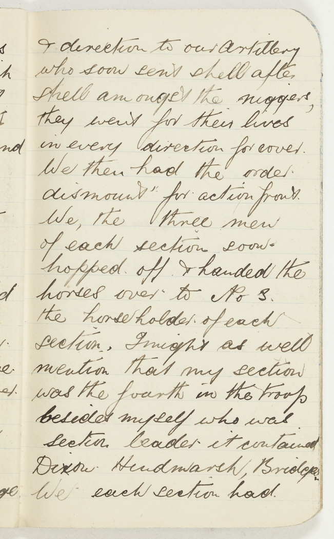 We, the three men of each section soon hopped off & handed the horses over to No.3 the horse holder of each section, I might as well mention that my section was the fourth in the troop besides myself who was section leader it contained Dixon, Hindmarsh, Bridges.