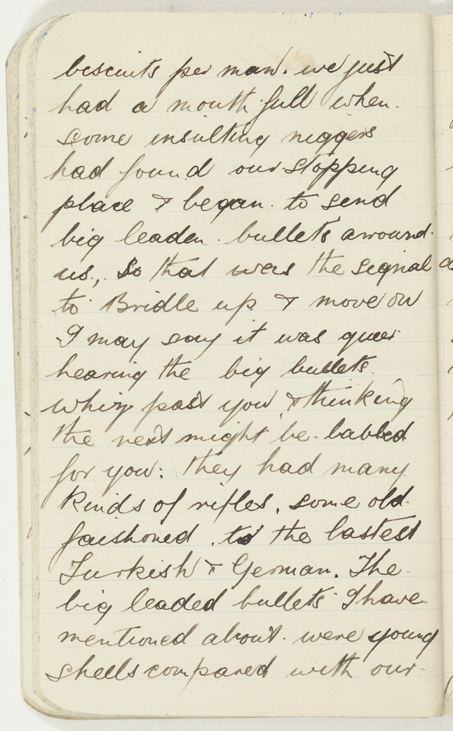 I may say it was queer hearing the big bullets whiz past you & thinking the next might be labled for you: they had many kinds of rifles, some old faishoned to the lastest Turkish & German. The big leaded bullets I have mentioned about were young shells compared with our