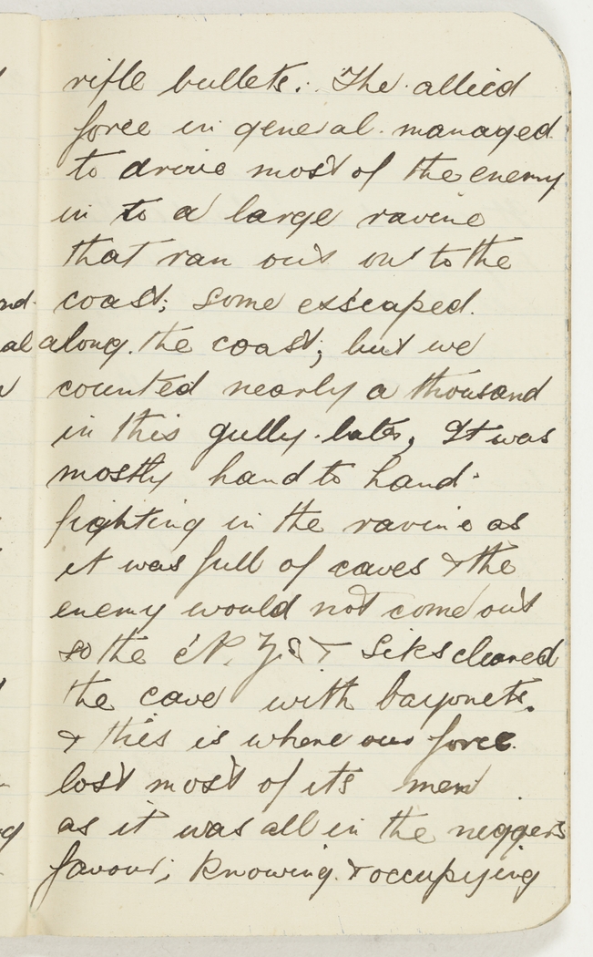 rifle bullets. The allied force in general managed to drive most of the enemy in to a large ravine that ran out on to the coast; Some exscaped along the coast, but we counted nearly a thousand in this gully later,