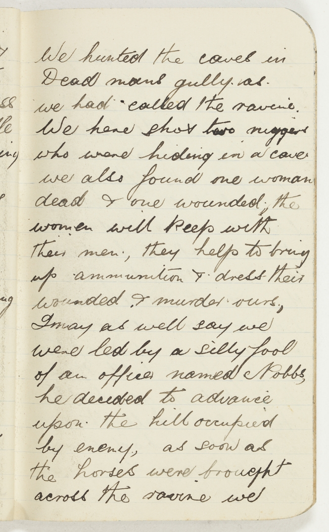 We also found one woman dead & one wounded; the women will keep with their men; they help to bring up ammunition & dress their wounded & murder ours,