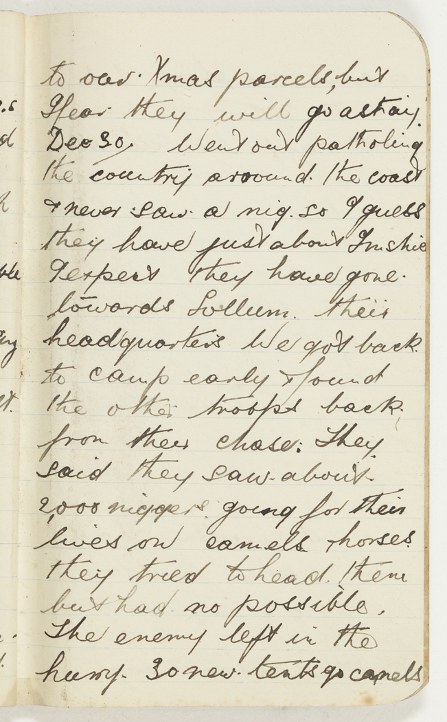 We got back to camp early & found the other troops back from their chase: They said they saw about 2,000 niggers going for their lives on camels & horses. They tried to head there but had no possible. The enemy left in the hurry. 30 new tents & 90 camels