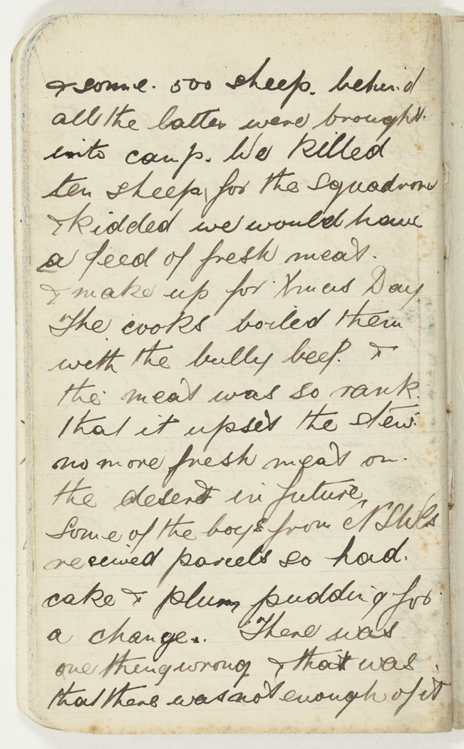 & some 500 sheep. behind all the latter were brought into camp. We killed ten sheep for the squadron & kidded we would have a feed of fresh meat & make up for Xmas Day.