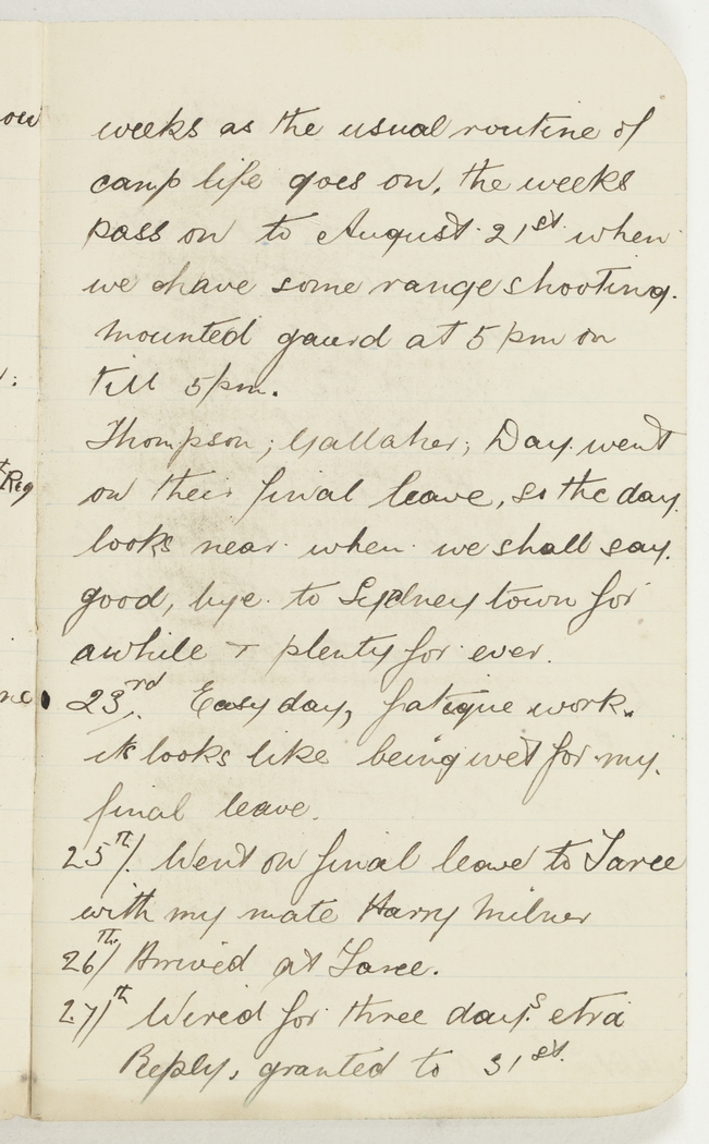 Thompson; Gallaher; Day went on their final leave, so the day looks near when we shall say good, bye to Sydney town for a while & plenty for ever.
