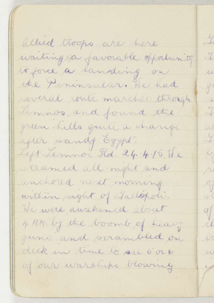 Left Lemnos Ild. 24.4.15. We steamed all night and anchored next morning within sight of Gallopoli. We were awakened about 4 a.m. by the boomb of heavy guns and scrambled on deck in time to see 5 or 6 of our warships blowing