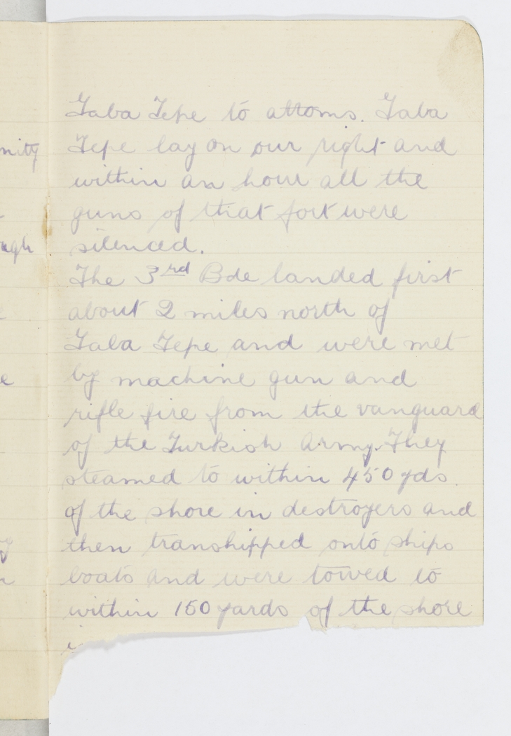 The 3rd Bde landed first about 2 miles north of Gaba Tepe and were met by machine gun and rifle fire from the vanguard of the Turkish Army. They steamed to within 450 yds. of the shore in destroyers and then transhipped onto ships boats and were towed to within 150 yards of the shore