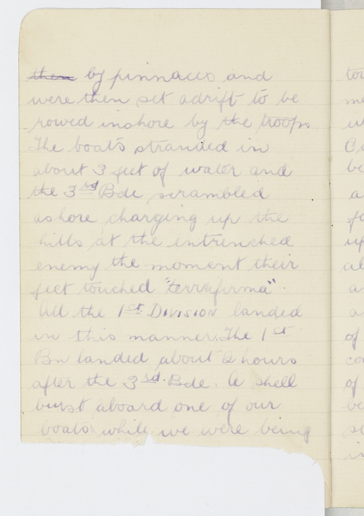 The boats stranded in about 3 feet of water and the 3rd Bde scrambled ashore charging up the hills at the entrenched enemy the moment their feet touched "terrafirma". All the 1st Division landed in this manner. The 1st Bn landed about 2 hours after the 3rd. Bde.