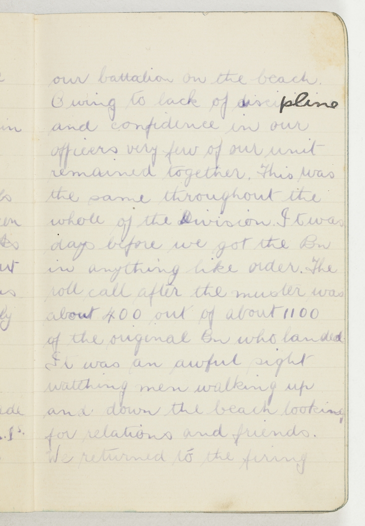 Owing to lack of discipline and confidence in our officers very few of our unit remained together. This was the same throughout the whole of the Division. It was days before we got the Bn in anything like order. The roll call after the muster was about 400 out of about 1100 of the original Bn who landed. It was an awful sight watching men walking up and down the beach looking for relations and friends.