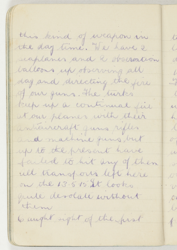 We have 2 seaplanes and 2 observation balloons up observing all day and directing the fire of our guns. The turks keep up a continual fire at our planes with their antiaircraft guns rifles and machine guns, but up to the present have failed to hit any of them.