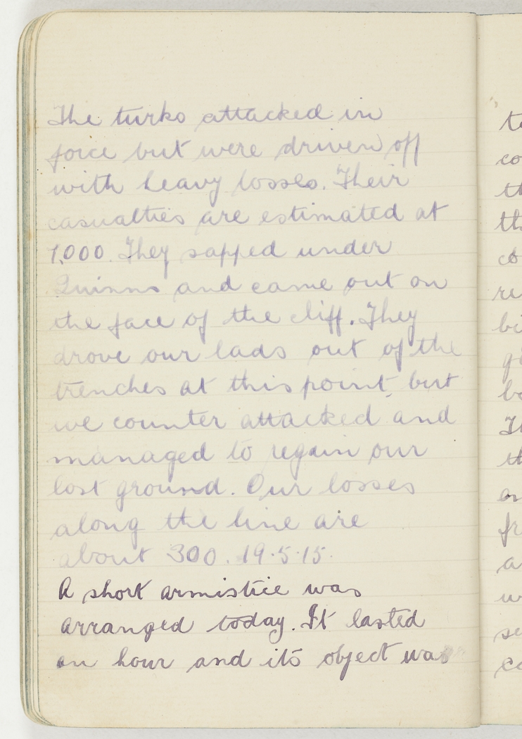 The turks attacked in force but were driven off with heavy losses. Their casualties are estimated at 1,000. They sapped under Quinns and came out on the face of the cliff. They drove our lads out of the trenches at this point, but we counter attacked and managed to regain our lost ground. Our losses along the line are about 300. 19.5.15.