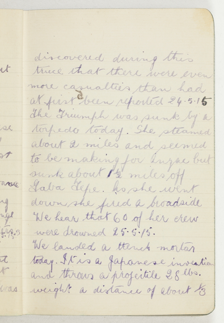 The Triumph was sunk by a torpedo today. She steamed about 2 miles and seemed to be making for Anzac but sunk about 1 ½ miles off Gaba Tepe. As she went down she fired a broadside. We hear that 60 of her crew were drowned 25.5.15.