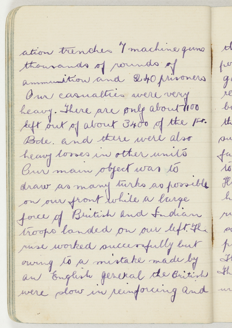 Our man object was to draw as many turks as possible on our front while a large force of British and Indian troops landed on our left. The ruse worked successfully but owing to a mistake made by an English General the British were slow in reinforcing and