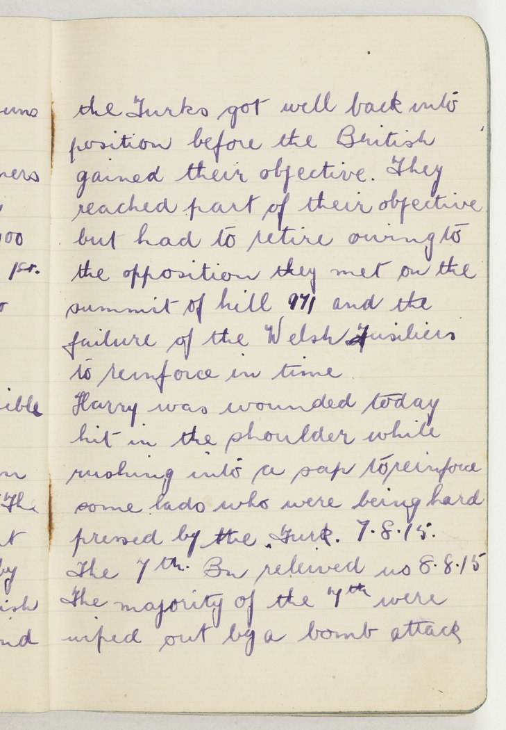 Harry was wounded today hit in the shoulder while rushing into a sap to reinforce some lads who were being hard pressed by the Turk. 7.8.15.