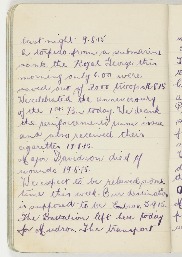 A torpedo from a submarine sank the Royal George this morning only 600 were saved out of 2000 troops 16.8.15.