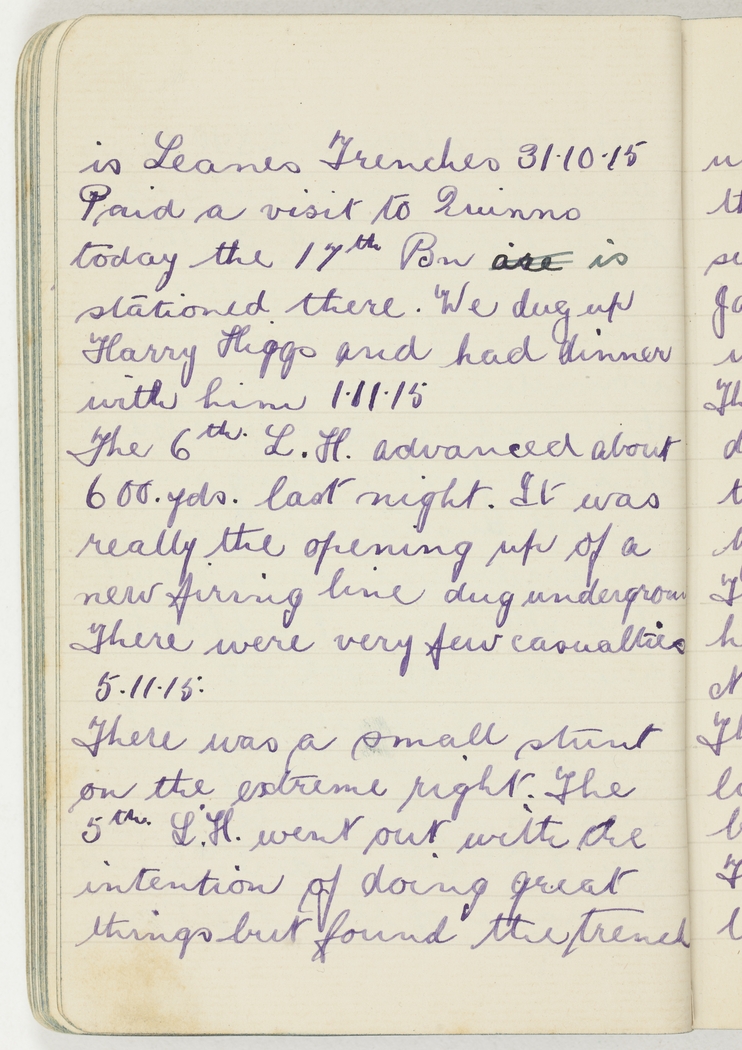 Paid a visit to Quinns today the 17th Bn are is stationed there. We dug up Harry Higgs and had dinner with him 1.11.15