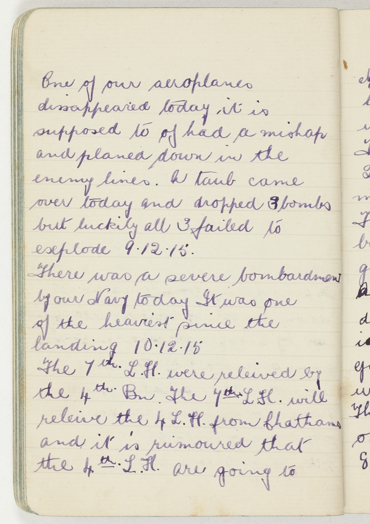 One of our aeroplanes disappeared today – it is supposed to of had a mishap and planed down in the enemy lines. A taub came over today and dropped 3 bombs but luckily all 3 failed to explode 9.12.15.