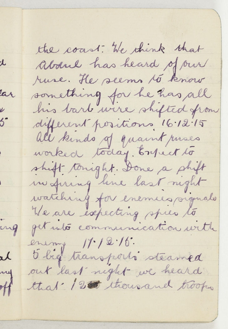All kinds of quaint ruses worked today. Expect to shift tonight. Done a shift in firing line last night watching for enemies signals. We are expecting spies to get into communication with enemy 17.12.15.