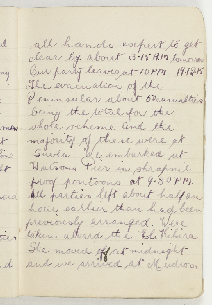 The evacuation of the Peninsular about 50 casualties being the total for the whole scheme and the majority of these were at Suvla. We embarked at Watsons Pier in shrapnil proof pontoons at 9.30 pm. All parties left about half an hour earlier than had been previously arranged. Were taken aboard the El Kihira. She moved off at midnight and we arrived at Mudros