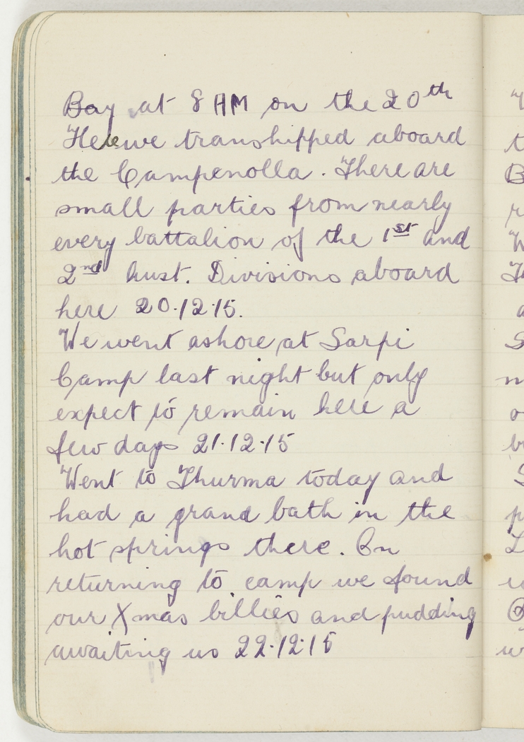 Went to Thurma today and had a grand bath in the hot springs there. On returning to camp we found our Xmas billies and pudding awaiting us 22.12.15