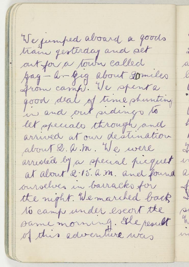 We jumped aboard a goods train yesterday and set out for a town called Zag-A-Zig about 20 miles from camp. We spent a good deal of time shunting in and out sidings to let specials through and arrived at our destination about 2 a.m. We were arrested by a special picquet at about 2.15 a.m. and found ourselves in barracks for the night. We marched back to camp under escort the same morning. The result of this adventure was