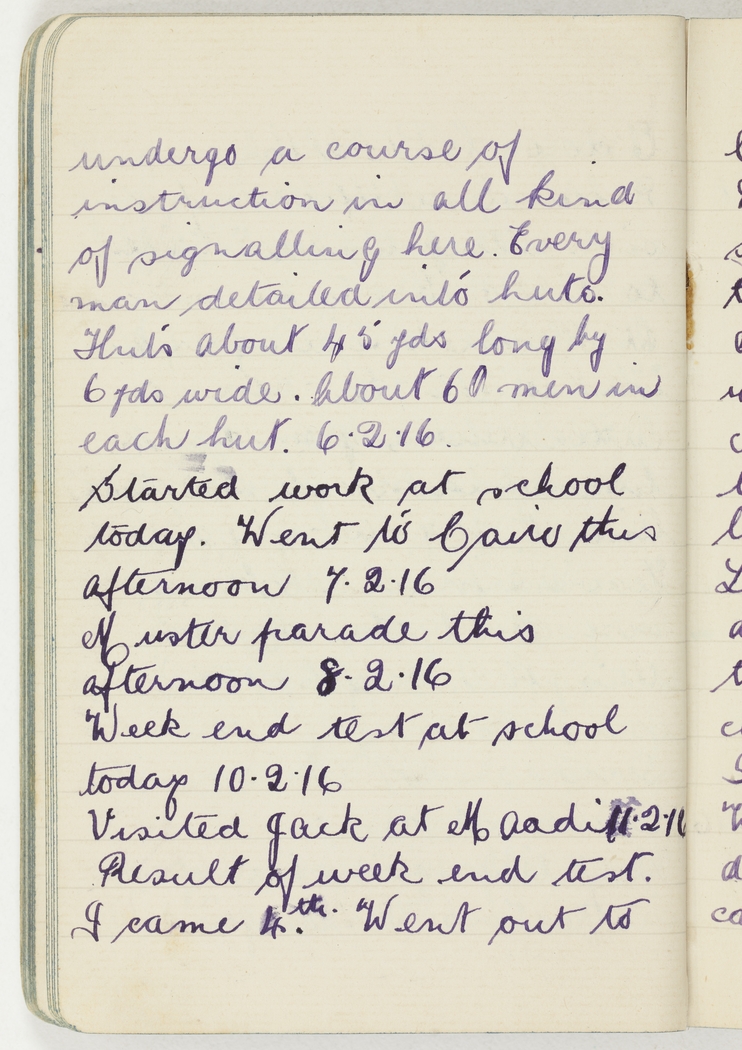 undergo a course of instruction in all kind of signalling here. Every man detailed into huts. Huts about 45 yds long by 6 yds wide. About 60 men in each hut. 6.2.16.