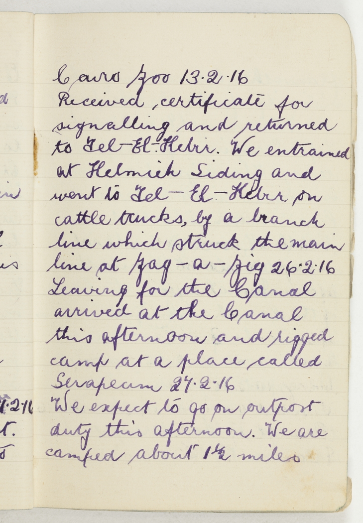 Received certificate for signalling and returned to Tel-El-Kebir. We entrained at Helmieh Siding and went to Tel-El-Kebir on cattle trucks, by a branch line which struck the main line at Zag-a-Zig 26.2.16