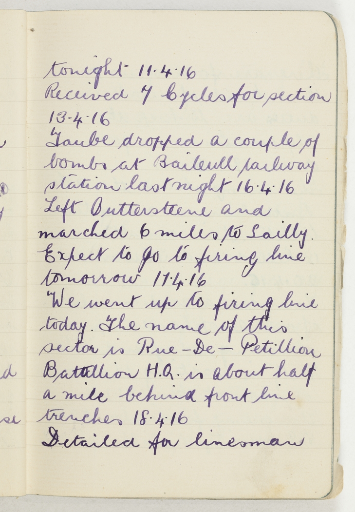 We went up to firing line today. The name of this sector is Rue-De-Petillion. Batallion H.Q. is about half a mile behind front line trenches 18.4.16