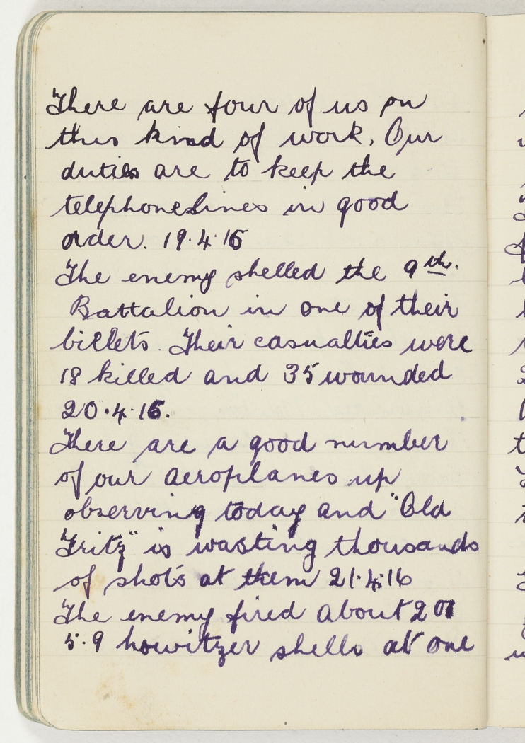 There are a good number of our aeroplanes up observing today and "Old Fritz" is wasting thousands of shots at them 21.4.16