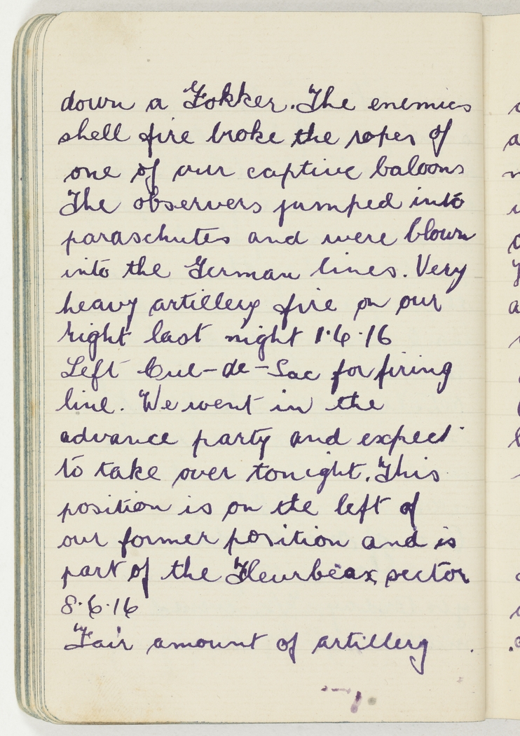 down a Fokker. The enemies shell fire broke the ropes of one of our captive baloons. The observers jumped into paraschutes and were blown into the German lines. Very heavy artillery fire on our right last night 1.6.16.