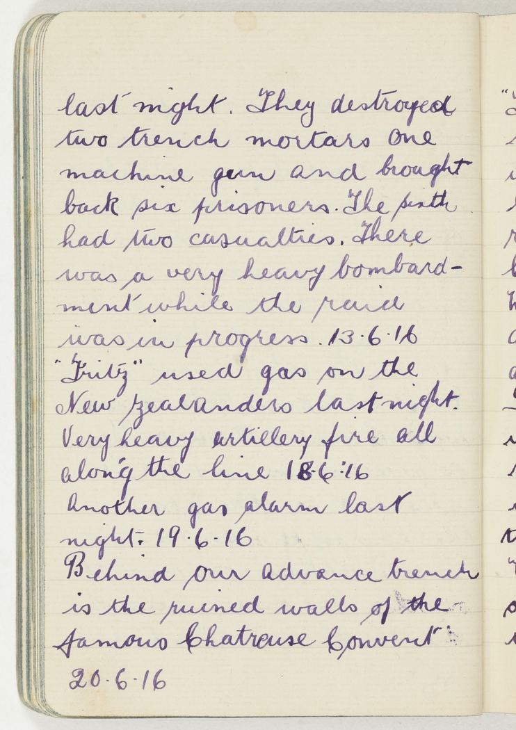 "Fritz" used gas on the New Zealanders last night. Very heavy artillery fire all along the line 18.6.16