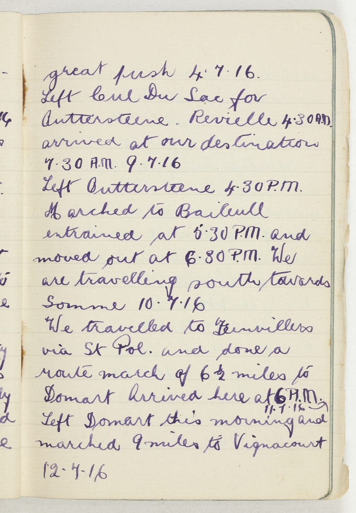 We travelled to Feinvillers via St Pol. and done a route march of 6 ½ miles to Domart. Arrived here at 6 a.m. 11.7.16