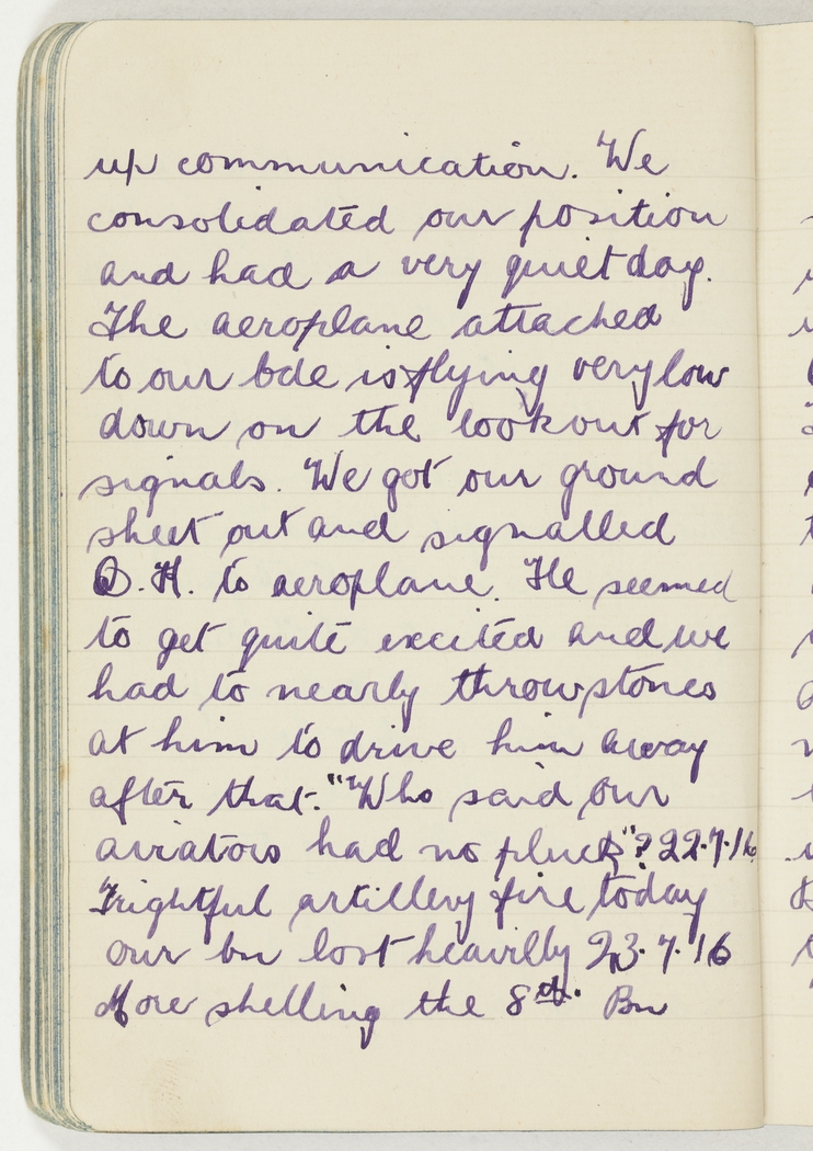 up communication. We consolidated our position and had a very quiet day. The aeroplane attached to our bde is flying very low down on the lookout for signals. We got our ground sheet out and signalled B.H. to aeroplane. He seemed to get quite excited and we had to nearly throw stones at him to drive him away after that. "Who said our aviators had no pluck"? 22.7.16