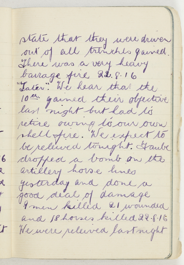"Later". We hear that the 10th gained their objective last night but had to retire owing to our own shell fire. We expect to be releived tonight. Taube dropped a bomb on the artillery horse lines yesterday and done a good deal of damage. 9 men killed 21 wounded and 18 horses killed 22.8.16