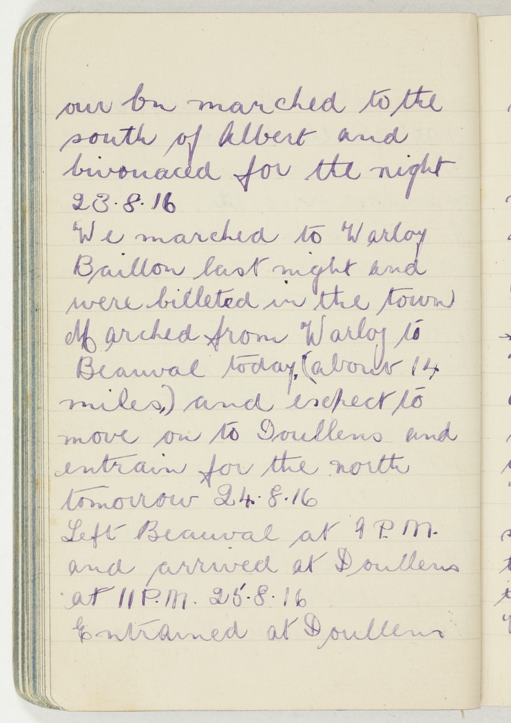 We marched to Warloy Baillon last night and were billeted in the town. Marched from Warloy to Beauval today, (about 14 miles,) and expect to move on to Doullens and entrain for the north tomorrow 24.8.16