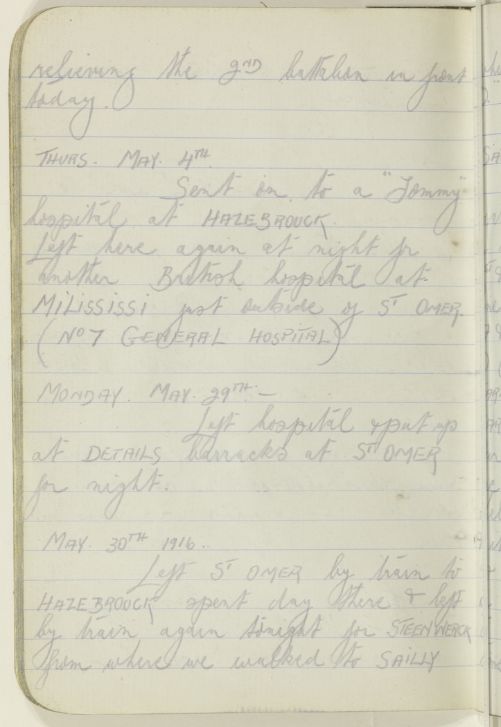 Left St Omer by train to Hazebrouck spent day there amp; left by train again tonight for Steenwerck from where we walked to Sailly where the Bn. is billeted. Rejoined "D" Company.