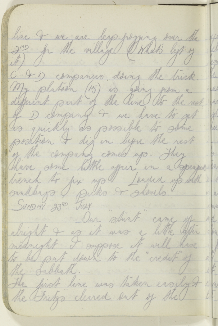The first line was taken easily & the "Fritzs" cleared out of the second. Once out amongst the shells we did not think much of them but the belly crawl out of the sally port with the German machine gun playing on the sides made of sandbags a couple of feet high made us think things.