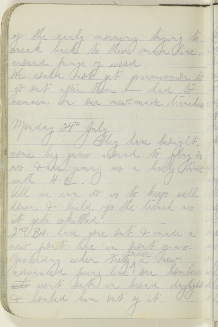 2nd Bn. Have gone out & made a new front line in front of us. Yesterday when Fritz made a new advanced firing line our bombers whe went out in broad daylight & bombed him out of it.