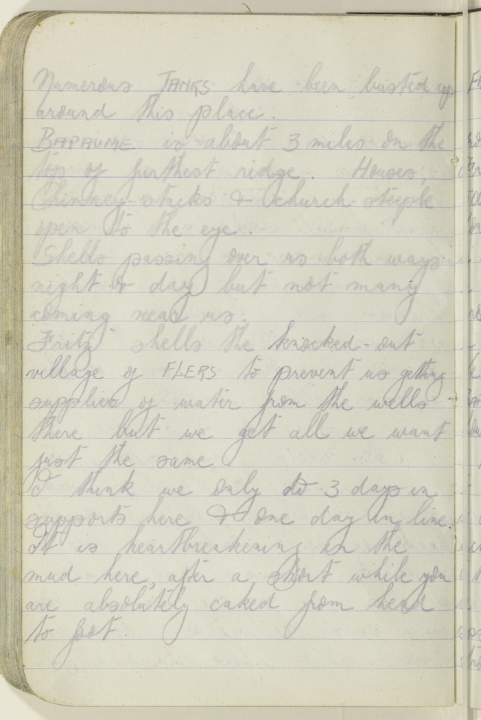 "Fritz" shells the knocked-out village of Flers to prevent us getting supplies of water from the wells there but we get all we want just the same.