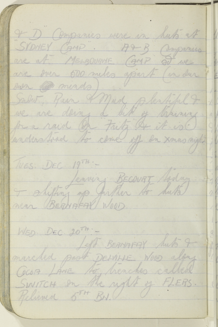 & "D" Companies were in huts at "Sydney Camp". A & B Companies are at Melbourne Camp so we are over 500 miles apart (in our own minds).