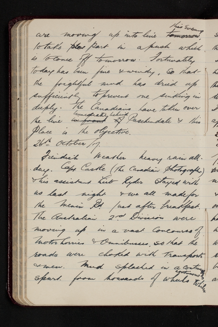 Fiendish weather heavy rain all day. Capt. Castle (The Canadian photographer) & his assistant Liet Ryder stayed with us last night & we all made for the Menin Rd just after breakfast. The Australian 2nd Division were moving up in a vast Concourse of Motor Lorries & Omnibuses, so that the roads were choked with Transports & men. Mud splashed in a continuous spurt from thousands of wheels whilst