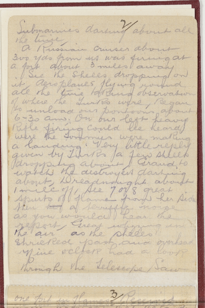 A Russian cruiser about 300 yds from us was firing at a fort about 3 miles away. See the shells dropping on it. Aeroplanes flying round all the time taking observations of where the Turks were. Began to unload our pontoons about 6.30 am. On our left heavy Rifle firing could be heard were [where] the Tommies were making a landing. Very little reply given by Turks, a few shells dropping about. Grand to watch the destroyers darting about, Dreadnought about 1 mile off. See 7 or 8 great spurts of flames from her side then a terriffic noise as you would hear the report. Great whizzing in the air as the shells shrieked past and overhead. Nine oclock had a look through the Telescope. Saw